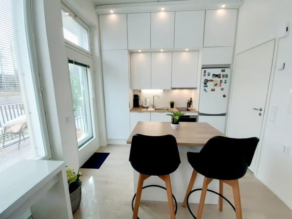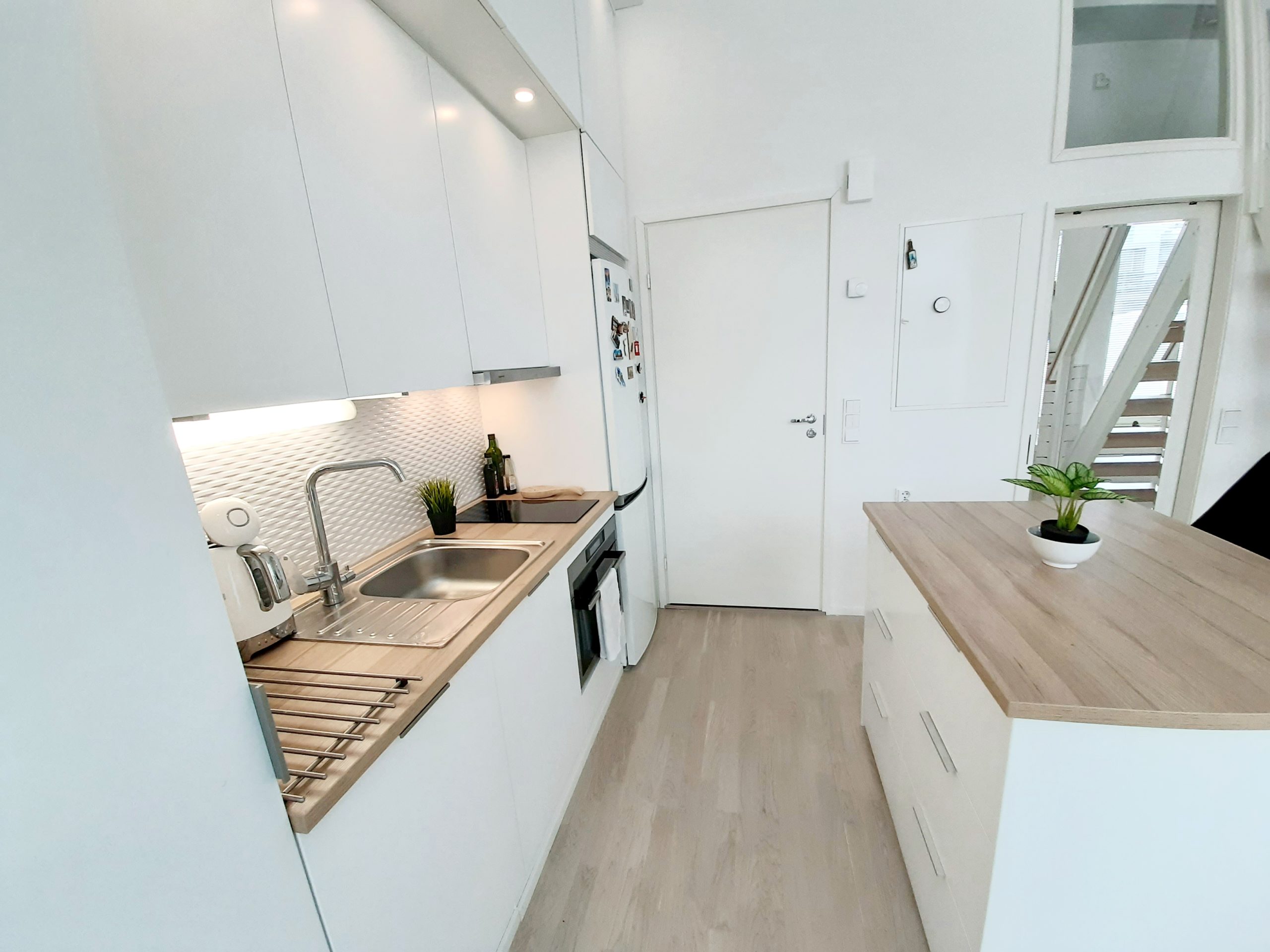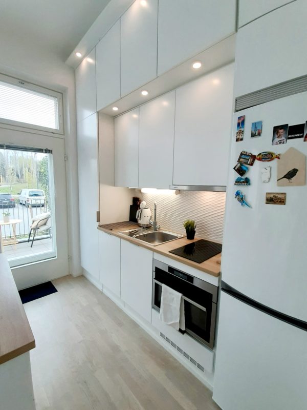 Keittiö on vaalea ja moderni led-valaistuksella ja saarekkeella, jonka äärestä löytyy myös ruokailutilaa. Säilytystilaa on peruskaappien lisäksi sekä saarekkeessa että tuplayläkaapeissa. Välitilassa kaunis struktuurilaatoitus. Keittiössä on keraaminen liesitaso, erillinen compact-uuni integroidulla mikrotoiminnolla, jääkaappipakastin ja integroitu astianpesukone sekä runsaasti kaappi- ja säilytystilaa. Kylpyhuoneessa on tilavaraus pesukoneelle ja kuivausrummulle, peili- ja allaskaapit, laatoitetut seinät ja lattiat sekä lattialämmitys.