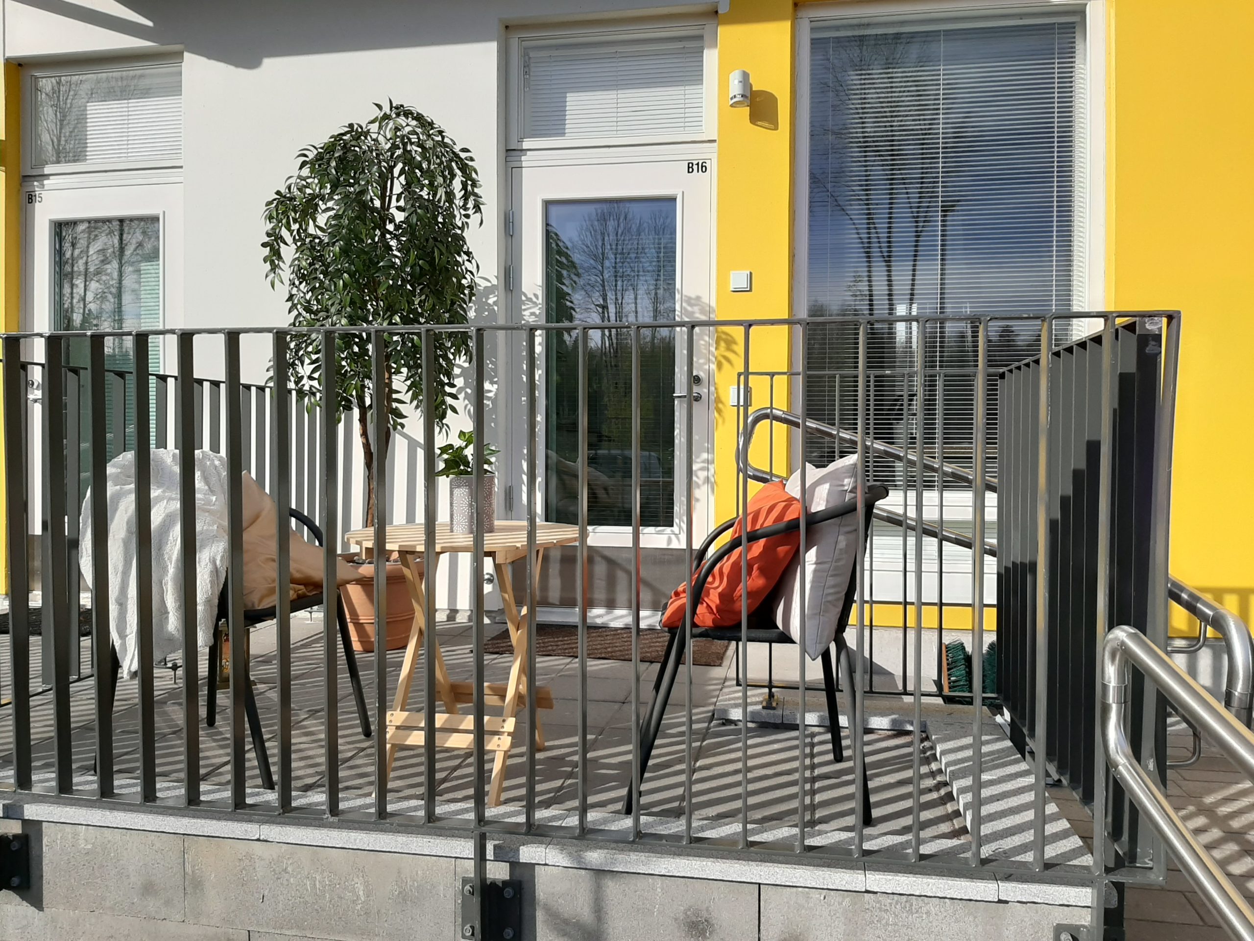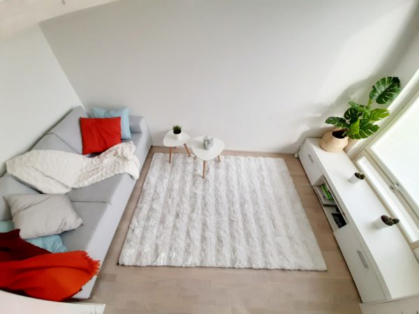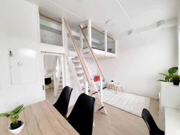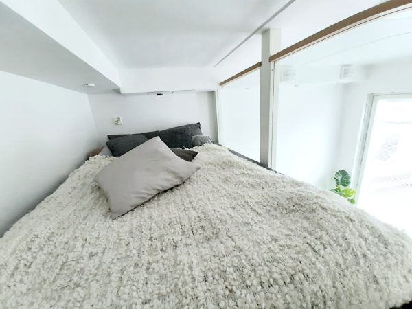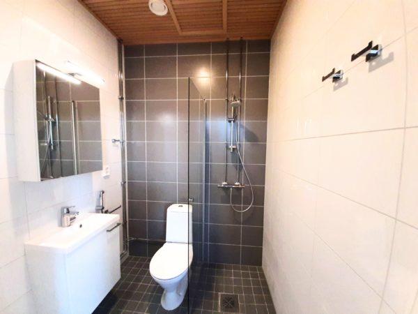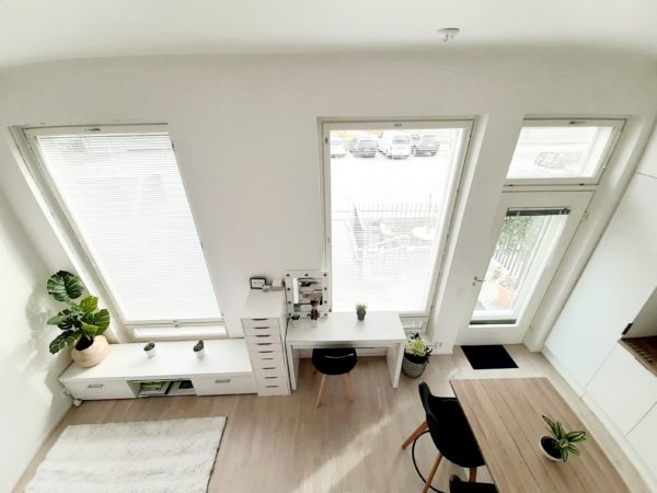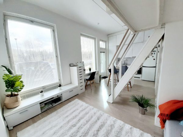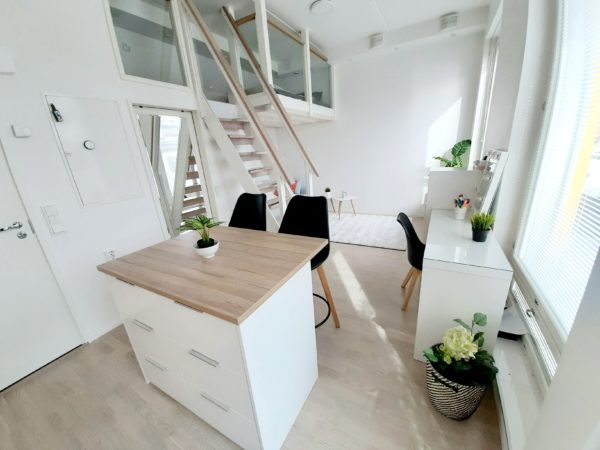 Vaatehuone sisältää säilytystilat siivousvälineille sekä tanko- ja hyllytilaa vaatteille ja asusteille. Nukkumaparven koko on n. 5 m2 ja myös siellä on säilytystilaa. Parven alla alkovissa on normaali seisomakorkeus ja led-valaistus, samoin osassa olotilaa. Parven ja keittiön led-valoja pystyy säätämään etänä. Asunnossa on terassi sekä oma piha, josta löytyy autopaikka aivan oven vieressä! Huoneistoon kuuluva irtaimistovarasto sijaitsee piharakennuksessa.