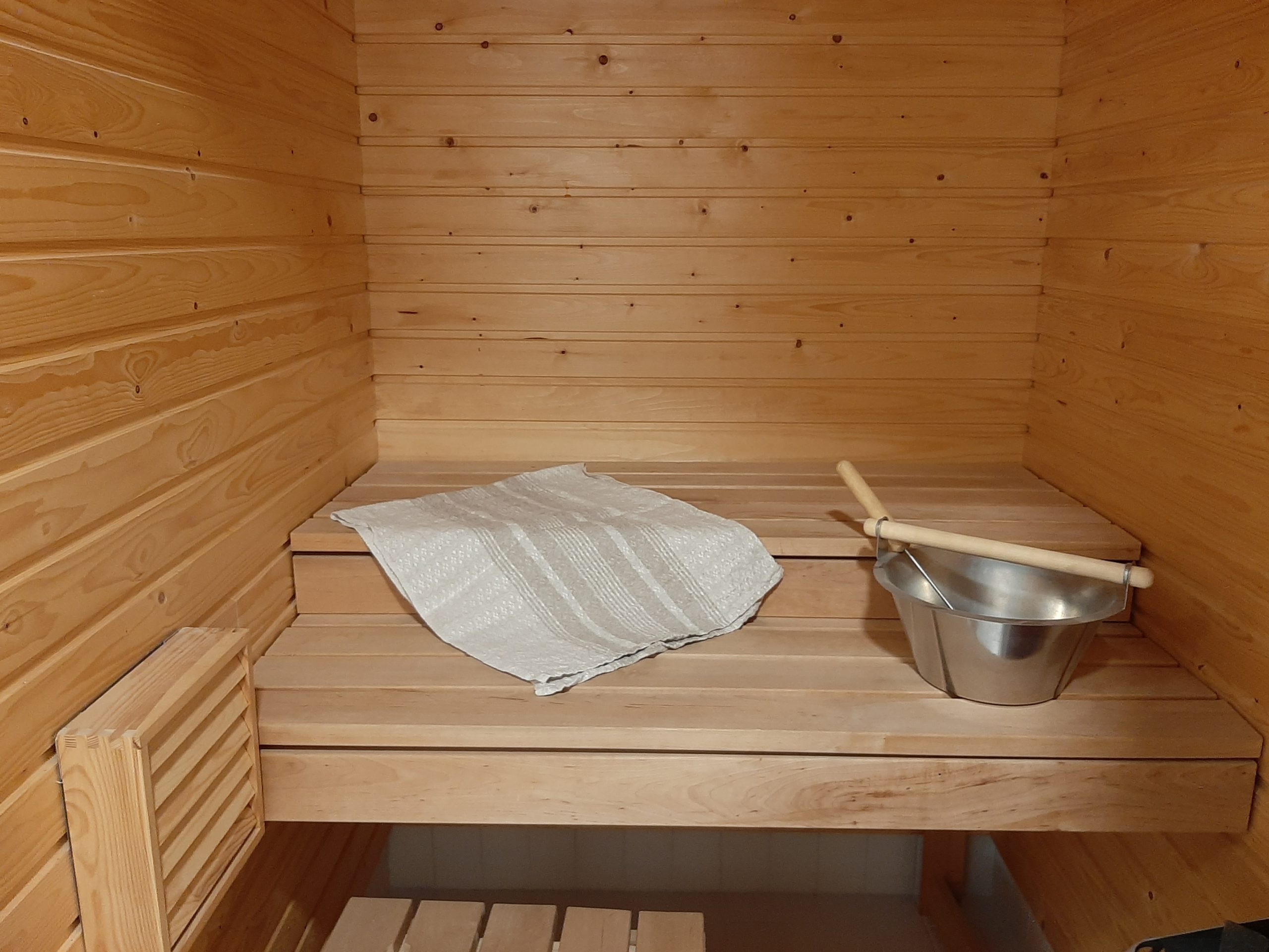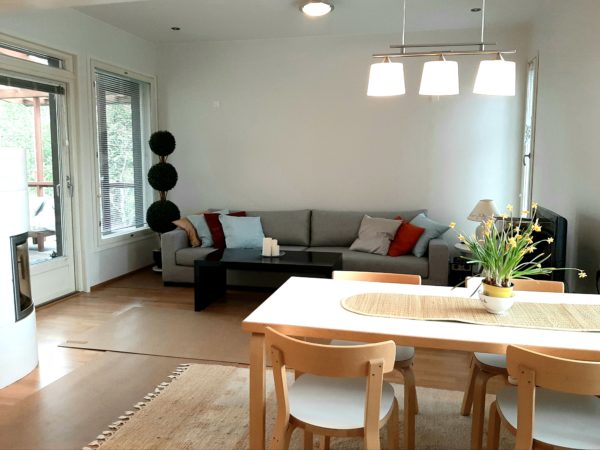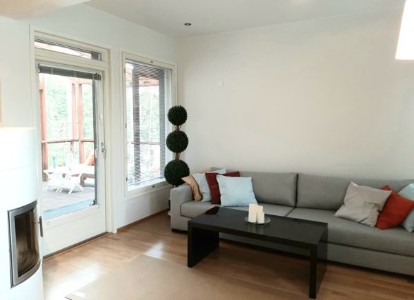 Huoneisto on valoisa ja siinä on ikkunoita useaan suuntaan, näkymät avautuvat omalle eteläterassille ja pihalle. Asunnossa on uusi tammiparkettilattia ja vesikiertoinen lattialämmitys koko alalla. Eteisessä on iso valkoinen liukuovikaapisto, jonka takaa löytyy monimuotoista vaate- ja säilytystilaa. Olohuone on avara ja siinä on tilaa sekä isolle istuskeluryhmälle että kunnon ruokailuryhmälle, lisäksi olohuoneessa on ilmakiertoinen puilla lämpiävä takka. Keittiö on vaalea, osittain uusittu ja siinä on niemeke olotilan suuntaan, kodinkoneina jääkaappipakastin, keraaminen liesitaso, erillisuuni, liesituuletin ja astianpesukone. Makuuhuoneessa on liukuovikaapisto sekä hyllykaappi. Asunnossa on myös erillinen vaatehuone/sisävarasto. Erittäin tilava kylpyhuone on laatoitettu valkoisilla laatoilla. Kylpytiloissa on suihkunurkkaus, allaslaatikostot sekä erillinen kodinhoitopiste, jossa on kaappitilaa ja pesukonevalmius sekä tarvittaessa paikka kuivausrummulle. Rentoutumisen kruunaa oma sauna.