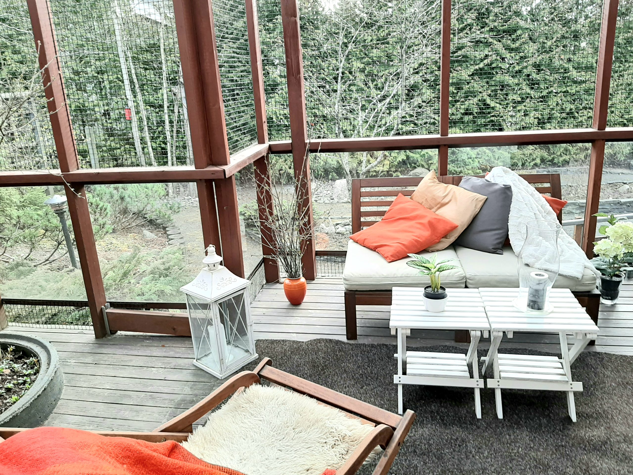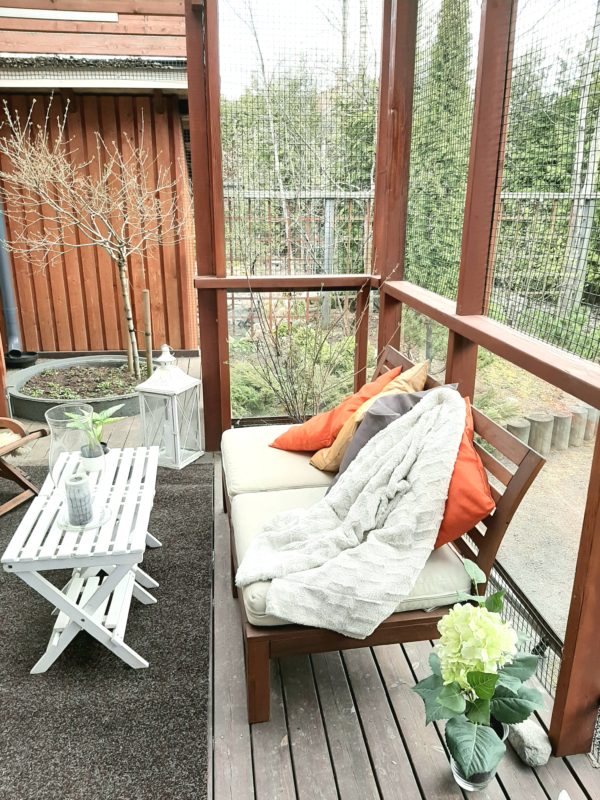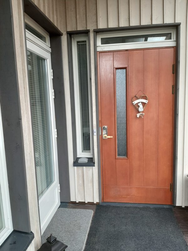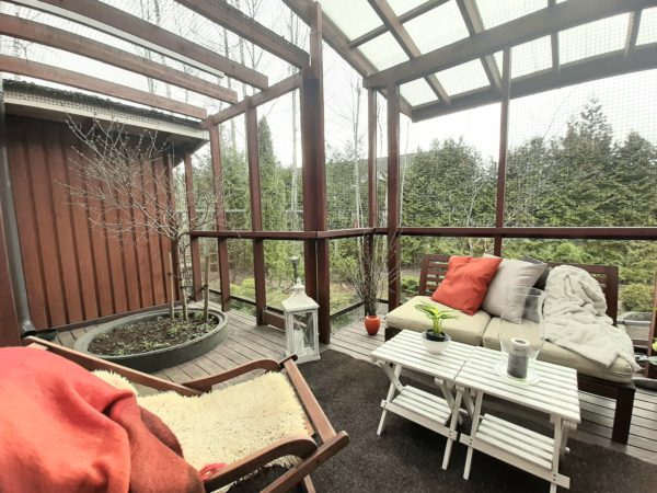 Pihaan on istutettu puita, pensaita sekä perennoja, siellä on myös pihavalaistus ja pihavarasto. Aurinko paistaa terasille lähes koko päivän ajan. Terassin koko on n. 17 m2, josta katettua on n. 14 m2. Terassin ympärillä on pieneläinverkotus, jonka ansiosta mahdolliset omat lemmikit voivat myös viettää huoletonta ulkoelämää.